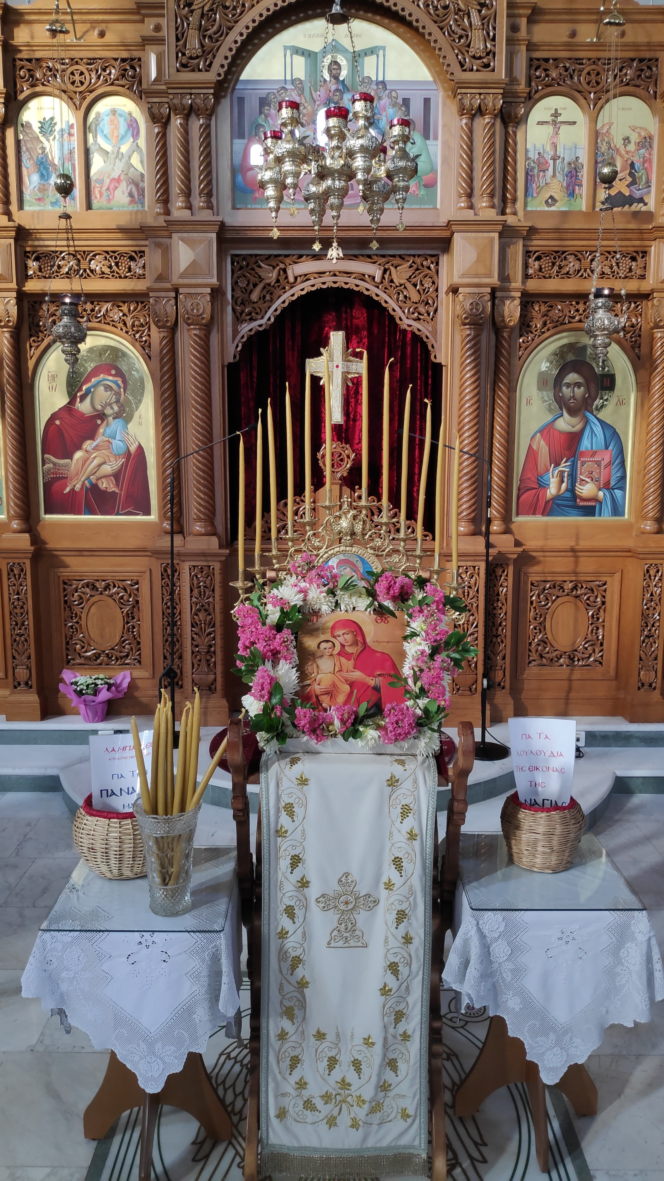 Η εικόνα της Παναγίας Θεοτόκου, τοποθετημένη σε περίτεχνο ξυλόγλυπτο τρισκέλι στον σολέα, στο κέντρο του ναού, αλλά και στο επίκεντρο της ζωής μας, πάντα αλλά ιδιαίτερα τις τελευταίες ημέρες, πάνω σε χειροποίητο ασπροκέντι περιτριγυρισμένη από φρέσκα άνθη και στολισμένη με πολύ αγάπη από τα λουλούδια των...Ανθόκηπων των σπιτιών μας, με το δωδεκακέρι της πλήρως αναμμένο και μ ετις δώδεκα αγνές από μελισσικέρι λαμπάδες, να φωτίζουν έτι περισσότερο το γλυκό πρόσωπο της Παναγίας μητέρας του Χριστού μας, της κόρης των δικών μας Αγίων, του Ιωακείμ και της Άννας και Εγγονού τους.