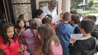 Ο δε π. Χρυσόστομος μας, ενθουσιασμένος και αυτός με την παρουσία και το ενδιαφέρον των παιδιών, τους ευχαρίστησε για την συμπροσευχή αυτή προς την Παναγία μας, τους έδωσε και από μια εικονίτσα με τον Ευαγγελισμό της Θεοτόκου, λόγω της εορτής πριν λίγες ημέρες, αλλά και από γλυκισματάκι, "...για να σας γλυκάνω και να ξανάρθετε στην εκκλησιά που σας χτίσαμε" όπως μας είπε με νόημα !!!Β
